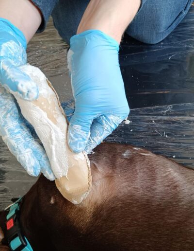 Gemeinsam mit den Tierärzten entschieden wir uns schließlich für einen Front-Rolli. Dies ist die beste Lösung, um Ottos Mobilität zu verbessern und das entzündete Bein zu entlasten. Dafür wurde ein Gipsabdruck erstellt und eine Testschale gefertigt, um die Passform und Funktion des Rollis zu prüfen. Als nächster Schritt folgt nun eine leichte, stabile Kohlefaser-Schale.